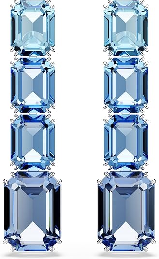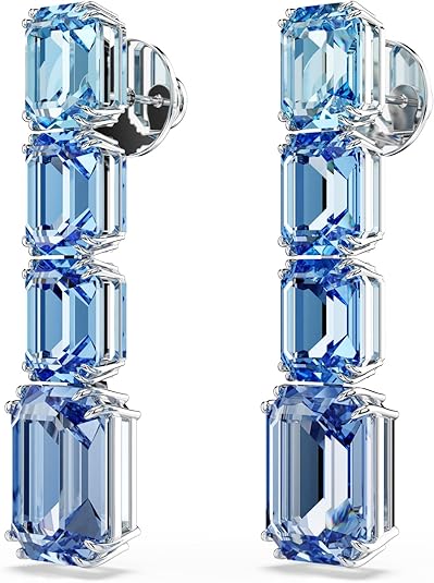 The “Millenia” philosophy is built on the concept of the “fundamental stroke”—a repeated geometric shape that creates a complex whole. In this blue gradient edition, Swarovski utilizes a precision-dyeing process across four distinct octagon-cut stones. The result is a seamless vertical ombré effect that mimics the shifting light of a horizon.